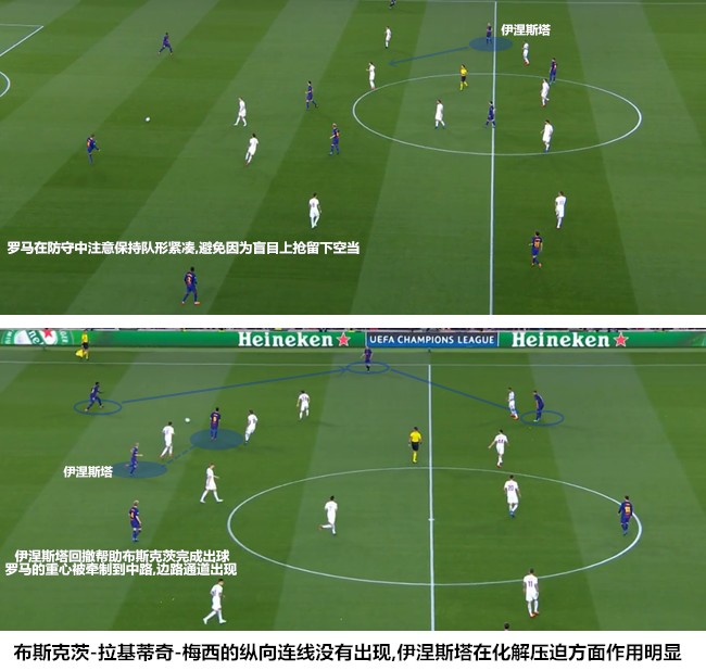 巴尔韦德这套442体系看似是通过加强两翼的兵力配置来到达到攻守平衡的效果,但整个体系的运转却不全是依靠边路来推动,而是依靠利用中路轴心的运转来带动两翼参与到比赛中,这个轴心就是布斯克茨和梅西。前者居于后场六边形体系的核心位置,既能源源不断地向前发牌,也能在由攻转守的瞬间延阻对手;后者不受位置、角色等条条框框的约束,在靠前的位置接球更有利于他的发挥。然而,由于罗马没有贸然实施高强度的逼抢,在向后收缩的过程中也非常注意压缩中路的空间,布斯克茨无法通过拉基蒂奇与高位的梅西取得联系,他只能在伊涅斯塔和罗贝托的帮助下将皮球通过边路向前发展。