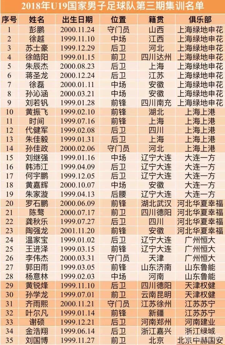 共有35名运动员入选本次集训名单,其中上海绿地申花队9人入选,上海上港和大连一方队各有5人入选。