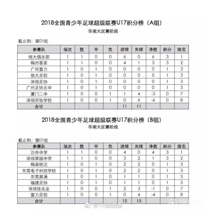 三、青超联赛U17年龄组(华南大区)首轮战罢,恒大、沙井中学分列各小组首位。