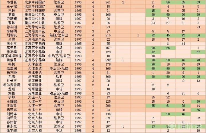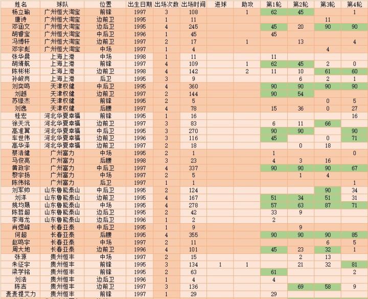 截至第4轮结束,中超联赛U23球员出场情况如下图:
