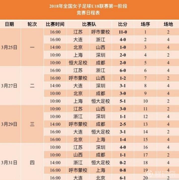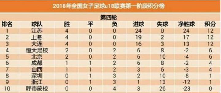 3月31日,2018年全国女子足球U18联赛第一阶段结束了全部四轮比赛。四轮赛事过后,江苏女足、上海女足和大连女足以四连胜的优异战绩排名前三位。江苏U18女足以24粒净胜球的优势领跑积分榜。