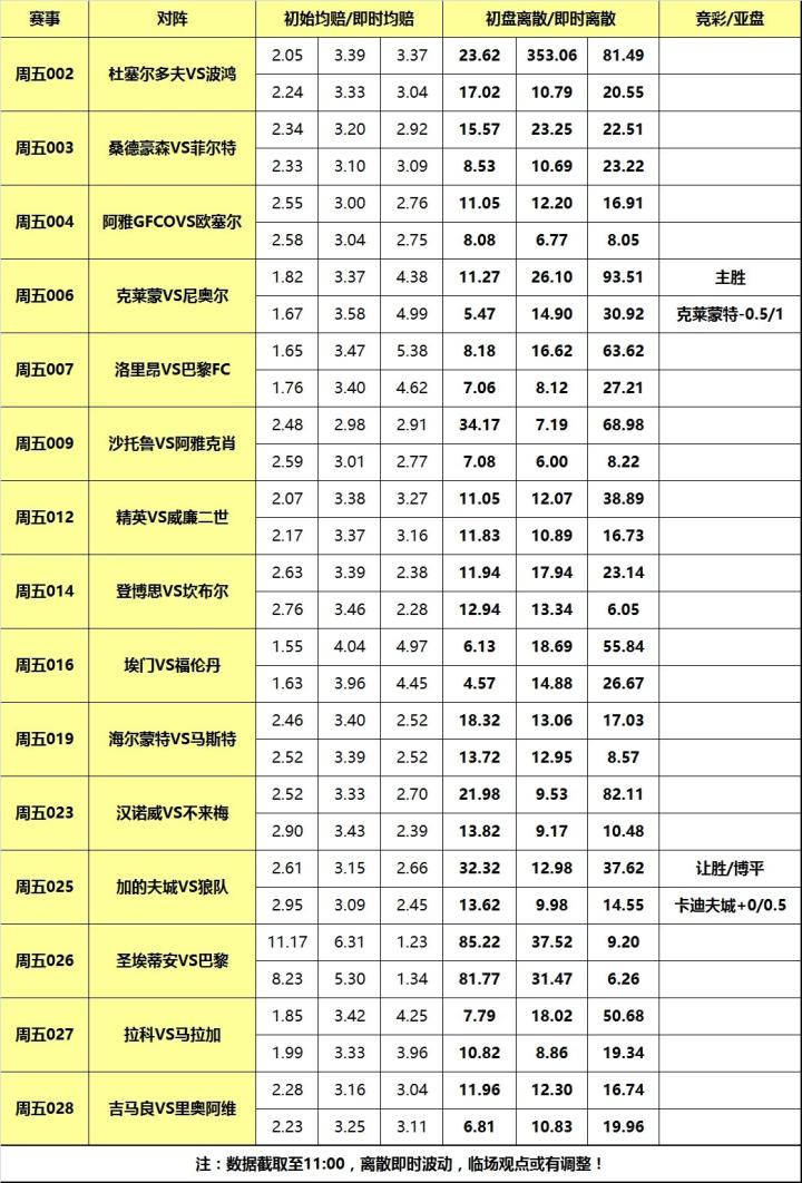 周五回归联赛组合,赛事主打法系和荷系联赛,五大联赛零星早场,大巴黎、不莱梅和马拉加等出战,英冠上演榜首大战。竞彩共计开售34场,早盘精选分享欧洲区精选15场联赛指数,另附英冠和法乙2场早盘解读。临场精选15场离散指数,全部比赛竞彩/亚盘观点,精选亚盘和串关主推,欢迎搜索关注“大嘴聊球”号获取!