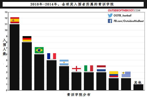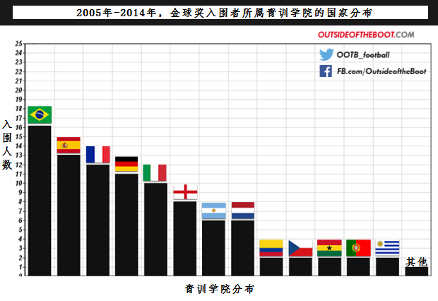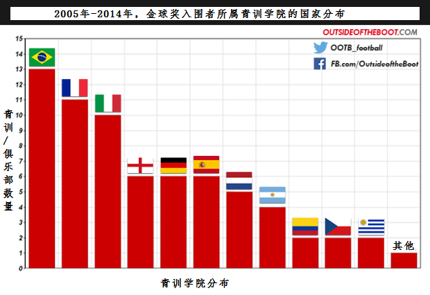 上图分析的是2005年-2014间青训营的国家分布情况。注意,不是入围者的国籍分布,而是产出这些入围者的青训营的分布。