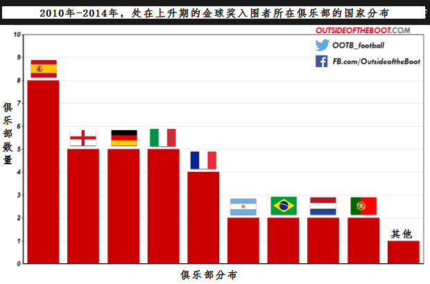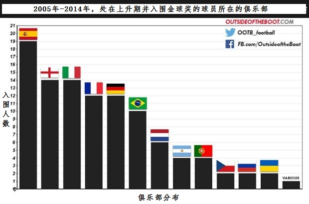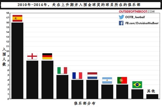 西班牙凭借16名入围者的强大优势占据了榜首位置(是第二名的两倍)。巴西停滞不前,情况堪忧。通常情况下,效力巴西俱乐部的球员会在很年轻的时候前往欧洲寻求发展,那些炙手可热的球员甚至在步入上升期之前,就已经离开了巴西。