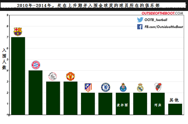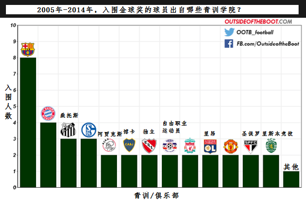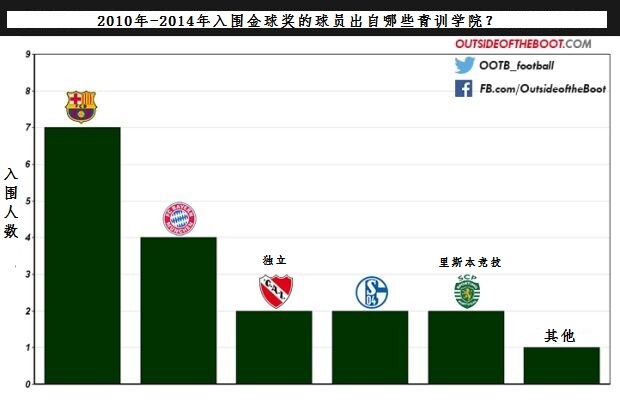有意思的是,那些只有一名入围者的球队里(被归类在“其他”一栏)既有卡吉体育(埃托奥)、布伦(里贝里)、华沙莱吉亚(莱万多夫斯基)、罗萨里奥中央(迪马利亚)、亨克(库尔图瓦)等等这样的“小”球队,也有皇马、曼联、以青训著称的阿贾克斯和南安普顿这种广为人知的大球会。此外,马竞、尤文图斯、利物浦、曼城以及大巴黎,在最近5年里没有一名青训代表入围金球奖。