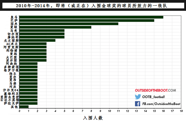 我们认为,在入围者得到金球奖提名之前的职业生涯里,每一个他曾经效力过的球队在不同方面(身体、战术理解、状态)都或多或少地给予了帮助。巴萨和皇马在这方面具有绝对的统治力,分别贡献了21和20名不同的球员,这些球员里有的正处于入围金球奖的当下,还有一些距离提名也仅一步之遥。在这41人里,绝大多数我们现在还能想起来。