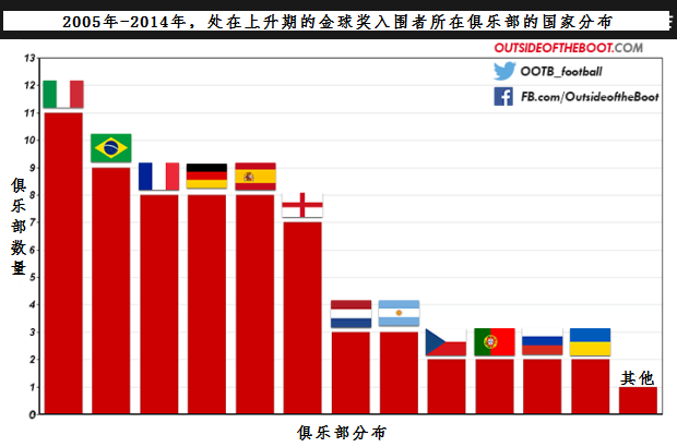 法国排在巴西之后高居第二位,其中七夺法甲冠军的里昂俱乐部贡献2人(卡努特和本泽马),其他俱乐部最多只有1人,比如布伦的里贝里和梅伦的马克莱莱。