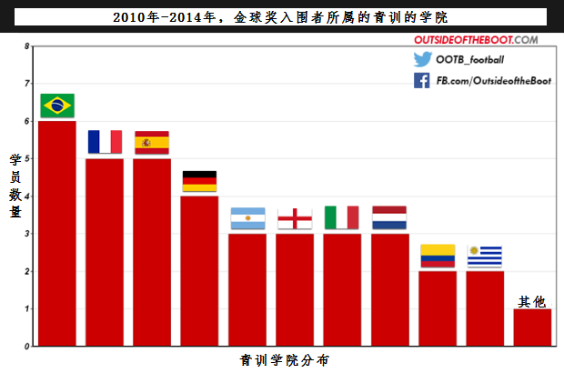 巴西依旧占据榜首。萨尔瓦多、巴塞罗那EC、克鲁塞罗、弗鲁米内塞、格拉哲乌以及桑托斯是培养巴西足球人才的六面旗帜。
