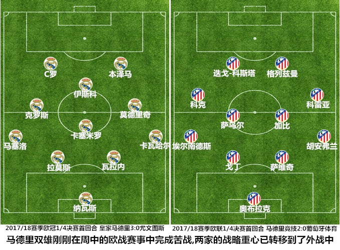 两位主帅的共同目标都是在做好轮换的同时争取胜利,由于赛季已经逐渐进入尾声,双方都没有采取大规模的轮换策略,马竞方面受制于于一线队编制不足而缺乏转圜空间,齐达内在近期的比赛中只会重用那些能够在欧冠中发挥做的替补球员。两位主帅都保留了周中欧战时的防线配置,皇马在中前场的轮换幅度较大,六名首发球员中只有C罗、克罗斯需要连续作战,马竞方面则有迭戈-科斯塔、格列兹曼、科克和萨乌尔四名球员承担着一周双赛的任务。