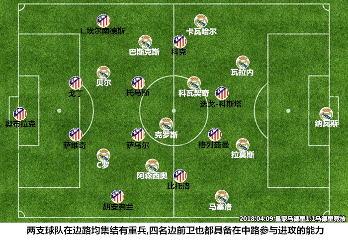 此役,双方都以442阵型作为战术蓝本,但进攻的侧重点却有所不同,皇马在大部分时间内掌控球权,两家围绕马塞洛/胡安弗兰所在的一侧区域展开了长时间激烈的争夺。根据赛后数据显示,双方的边路进攻比重都接近了80%,皇马排出了四名具备边路属性的前场攻击手,后续登场的莫德里奇和伊斯科也是在为边路进攻助阵,尽管防守表现不够完美,但皇马在进攻中的执行力、配合意识和传切流畅度还是值得肯定的。