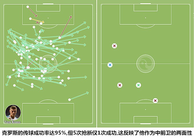 面对对手在前场的施压,皇马一般都会选择拉开空间,通过个人技术能力化解逼抢。在两名边后卫占据边路的情况下,阿森西奥会内收到中路与科瓦契奇、克罗斯形成倒三角站位在中路制造出局部优势。克罗斯进入马竞442体系在中场中路(双前锋身后)的空当中建构后场司令塔,德国人在后场中路的持球能够吸引马竞整个前场球员的注意力。此役,克罗斯的传球成功率达到了95%,他在两个禁区之间的区域只有两次传球没有到位,其审时度势的控制和分球总能让中前场的队友连成一片。
