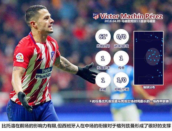 马竞在丢球后迅速实施反攻,很快扳平了比分。在不久前做客诺坎普的争冠六分战中,马竞的阵型曾长时间被压制在低位无法动弹,球队在整个上半场没能制造一次有威胁的进攻。此役,马竞的进攻效率比对阵巴萨时提升了不少,比托洛虽然没能起到预期中的边路效应,但他利用体格掩护进行内切衔接的打法还是巩固了马竞中场运输线,他和科克在中路能够牵制皇马的中前卫,与阵型顶端的迭戈-科斯塔形成纵深呼应,格列兹曼就能在两线之间得到自由驰骋的空间。