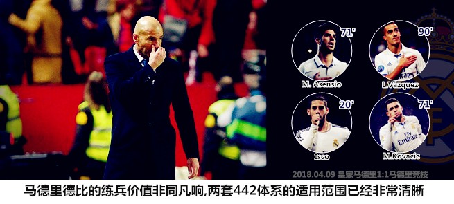上半场的进程再次证明一个道理,那就是尽管平行442自启用以来胜率极高,但其中的关键人物阿森西奥和巴斯克斯并不具备独撑大局的能力。两人在一板一眼的阵地进攻中效率不高,马竞的两名边后卫在单防时的对抗强度很大,一旦皮球的流动不够顺畅或者前场的空间遭到压缩,这对飞翼不能起到前场爆点应有的战术效果,他需要增加跑动、不断换位来制造空间,齐达内在关键比赛中依然继续使用菱形442是有道理的。随着比赛的深入,巴斯克斯频繁来到左肋部支援进攻,马竞在低位的轮换防守依然有条不紊,他们可以承受皇马在禁区外围连续进行的传导。