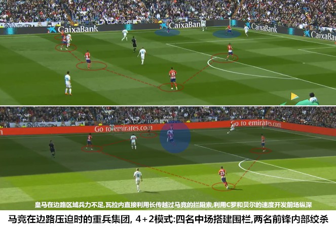 上赛季首回合较量,皇马便终结了联赛对马竞的不胜纪录,此战的成功经验就是要通过区域间的快速一脚传递快速通过马竞的中场防线,为锋线球员创造一对一挑战马竞后卫的机会。贝尔抹过卢卡斯-埃尔南德斯进入前场腹地的举动等于是为客队敲响了警钟,既然科克和比托洛能够自如地在边路和中路之间切换,马竞就不用担心反击时的兵力投送问题,在禁区附近布置两道防线显然是更加稳妥的防御模式。