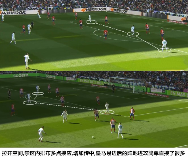 易边之后,齐达内改变了边路进攻的套路,皇马不在执着于局部小组渗透,而是在拉开空间后就迅速实施传中,阿森西奥和巴斯克斯分列两边而不再左路抱团。在阵地进攻中,皇马会形成一侧边前卫/边后卫联动、三前锋在禁区内等待传中的局面,在由守转攻阶段,双前锋之一的贝尔会游弋到左路接应马塞洛和阿森西奥,从马竞防线的外侧寻找传中机会。