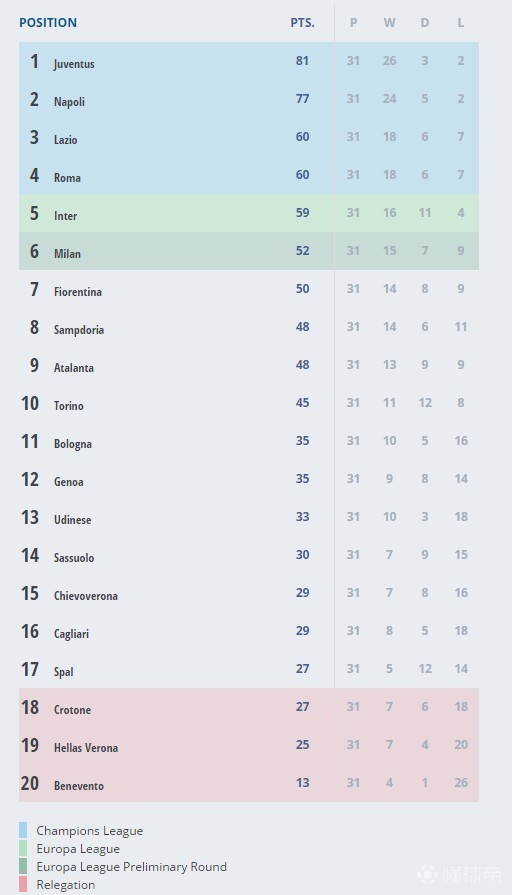 (31轮过后的意甲积分榜)