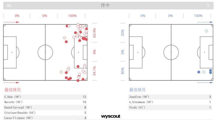 1-1战平马竞的比赛,占据进攻主动的皇马送出了疯狂的46次传中,那个进球同样来源于此。值得注意的是,皇马队内送出传中最多的前四位除了马塞洛和卡瓦哈尔之外,还有搭档双前锋的贝尔和C罗,这也足以说明进攻球员换位的灵活。