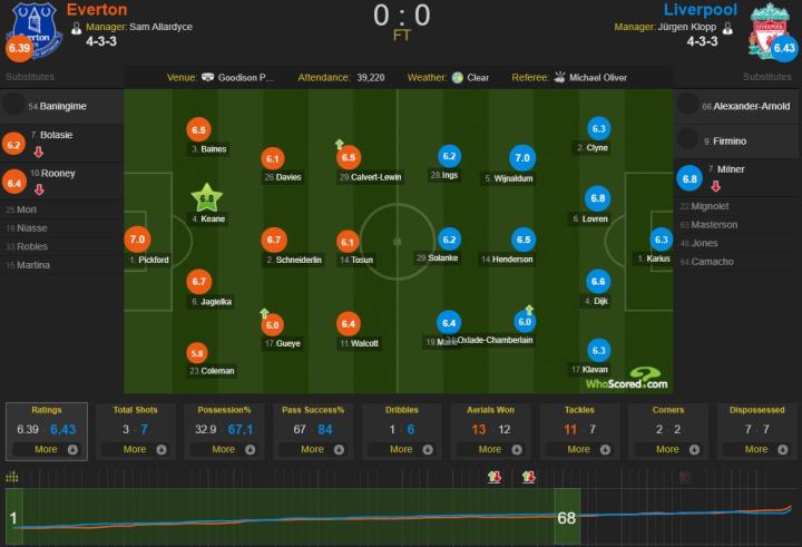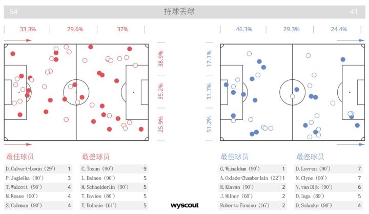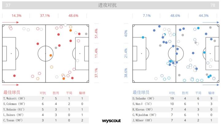 他们此役只有3次成功的过人,并且全都来自沃尔科特,比起对面的利物浦少了5次。一对一的进攻单人对抗,埃弗顿全队的尝试次数甚至不到利物浦的一半。