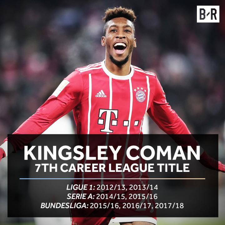4-1击败奥格斯堡之后,拜仁提前5轮拿下了德甲的冠军。如果有过出场就算的话,那么金斯利-科曼已经拥有了2个法甲、2个意甲、3个德甲一共7个联赛冠军的荣誉。