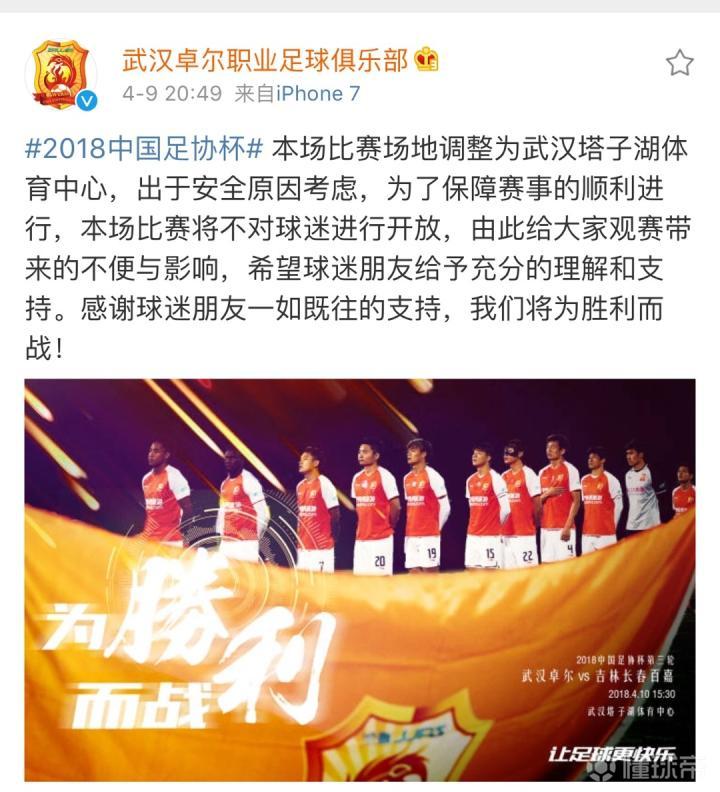 卓尔官方在微博中写道:“本场比赛场地调整为武汉塔子湖体育中心,出于安全原因考虑,为了保障赛事的顺利进行,本场比赛将不对球迷进行开放,由此给大家观赛带来的不便与影响,希望球迷朋友给予充分的理解和支持。感谢球迷朋友一如既往的支持,我们将为胜利而战!”