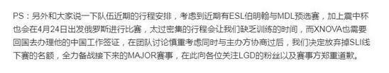 鉴于将有几大Major赛事临近,队伍训练时间有限,再加上XNOVA需要回国办理护照,LGD经理在文末指出LGD将放弃SLi线下赛名额。