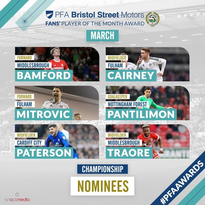 英格兰职业球员工会官方公布了上个月英冠联赛最佳球员的提名名单,富勒姆和米德尔斯堡各有两名球员入选。