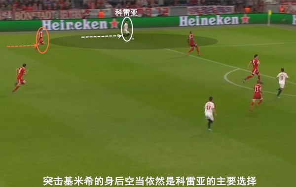 从战术设计来看,塞维利亚的主要攻击方向并没有发生改变。一是瞄准了拜仁后腰与双中卫之间的中路空当,通过前场球员的积极跑位试图把马丁内斯吸引上抢,随后由锋线球员寻觅其身后空当接应来球冲击拜仁防线;二是重点进攻基米希防守的拜仁右路。此前预测因伤无法登场的科雷亚看上去可是丝毫无碍,更像是奇兵般在边路继续发挥突破特长试图打开拜仁的边路缺口,并在基米希所把守的拜仁右路不断尝试“生吃”。