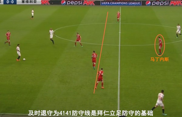 的确如此,面对塞维利亚在进攻端的故技重施,拜仁本场比赛的整体阵型回收非常坚决,由攻转守后明显回撤为4141的三道防线站位,率先稳住了球队的整体防守。其中,在中场球员身后的马丁内斯作为防守型后腰充分展现了能奔善抢的特点,这让塞维利亚的速度优势很难打出来。同时,基米希和拉菲尼亚在两侧成功站住了位置,并未给对方留下太多的突破空间。
