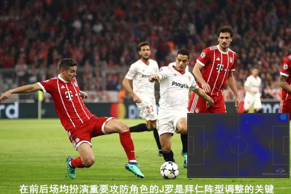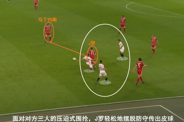 在塞维利亚的防守硬度终于有所下降后,拜仁则渐渐找到了自己的进攻节奏。于是在顶住塞维利亚的开局三把斧后,拜仁在上半场中段开始很好的控制球权并推动进攻。其中,作为中场核心的J罗适时回撤拿球和及时调度让塞维利亚的压迫防守不敢再过于激进,这让拜仁成功地不断把球运转到对方半场,并在上半场最后20分钟和下半场开场阶段彻底掌控了比赛的进攻主动权。