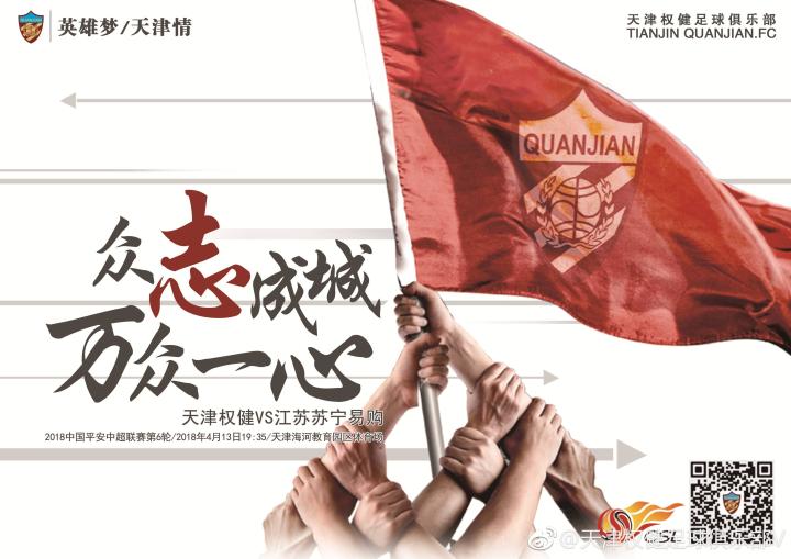 明天晚上19:35,天津权健将坐镇主场迎战江苏苏宁易购。今天天津权健官方发布了赛前海报,为比赛预热。