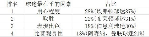 调查还显示,球迷们更在意球队在比赛中的拼劲和用心程度,而不是比赛结果。