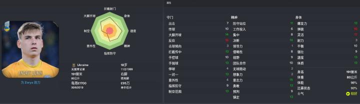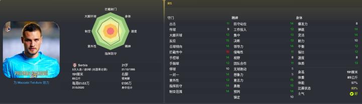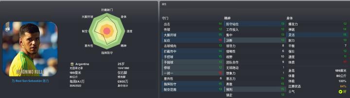 评价: 门将属性中庸 传球16是特色 喜欢控球打法的可以考虑 爆发10略显不足 只能打清道夫防守职责 跑得慢就别学诺伊尔大哥站在中场线防守了。