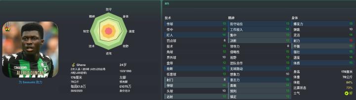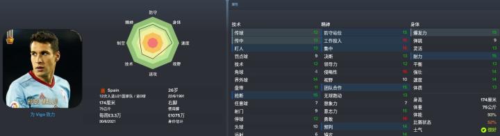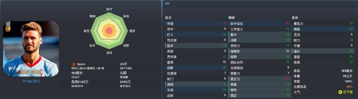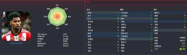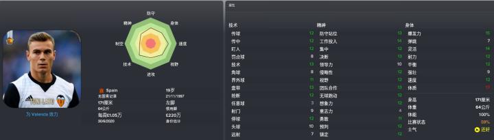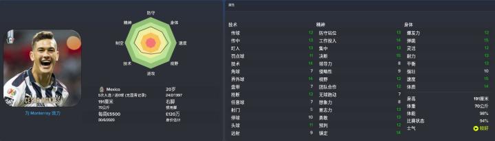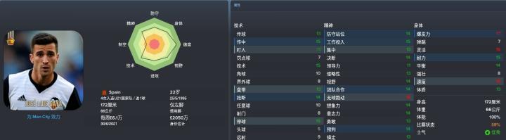 评价:性价比极高的出球中卫 技术、精神属性出色 防空略显不足 过了拜师年龄隐藏属性又全部随机是个小小隐患。
