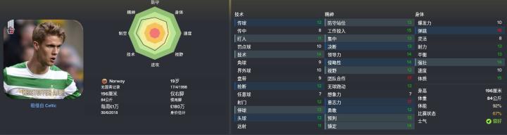 CA132 PA160 攻守兼备的组织型后腰 属性全面 防空远射极佳更是稀缺 耐力10是唯一短板 稳定14 大赛14 伤病倾向6 绝对的巨星潜质 雄心15 职业12 抗压12也说得过去。