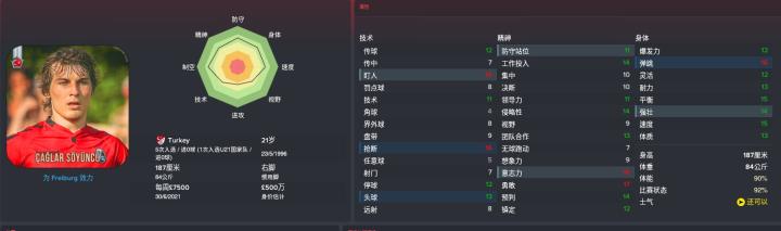 (6)弗莱堡 斯帕科维奇(Çaglar Söyüncü) 21岁 土耳其 3.5星推荐 预计花费2300万镑
