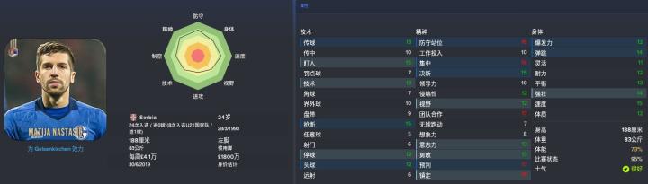 (3)沙尔克 纳斯塔西奇(Matija Nastasic) 24岁 塞尔维亚 4星推荐 预计花费2300万镑