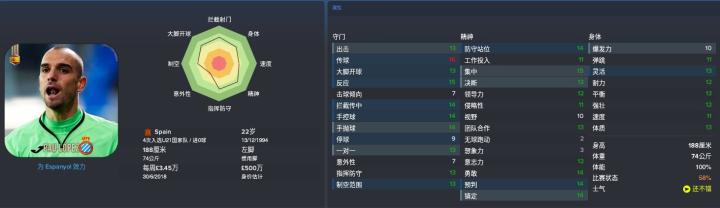 CA142 PA160 传球16 门将属性基本都在13-15 稳定16大赛13 受伤倾向6 适应性16 雄心14 职业12 抗压13