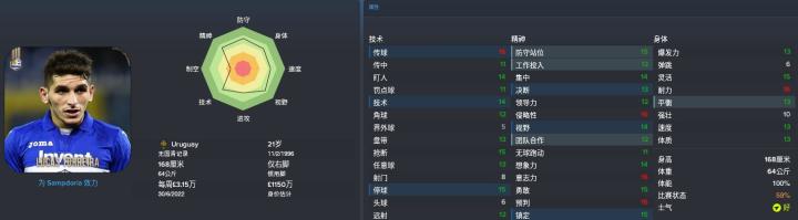 CA140 PA160 乌拉圭维拉蒂 极优秀的技术和精神属性 身体瘦小单薄 隐藏属性亮眼 稳定16 大赛13 受伤倾向5 雄心14 职业15 抗压11