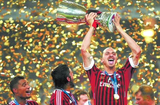 (图)伊布代表AC米兰在鸟巢捧起意大利超级杯的冠军奖杯