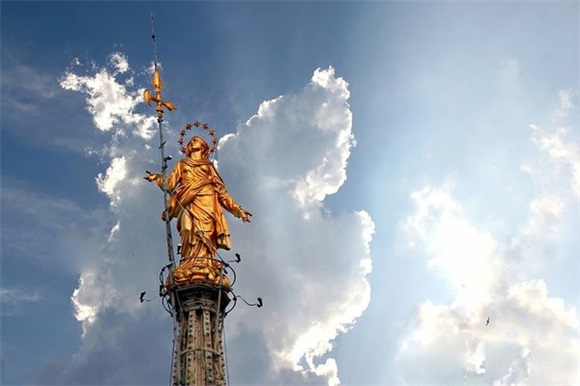 (图)米兰大教堂中央塔顶建成于1774年的圣母像,米兰德比的意大利语“il derby della Madonnina”正是得名于此
