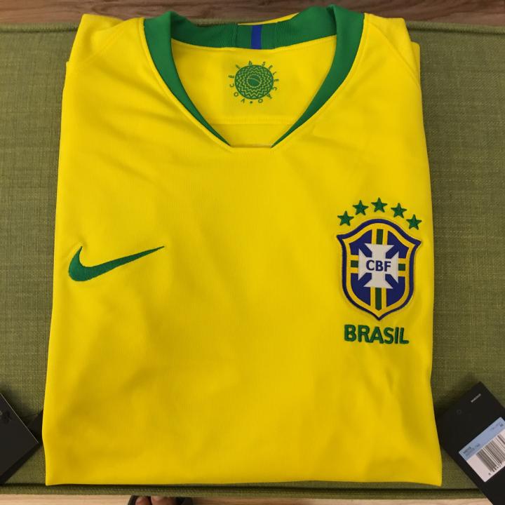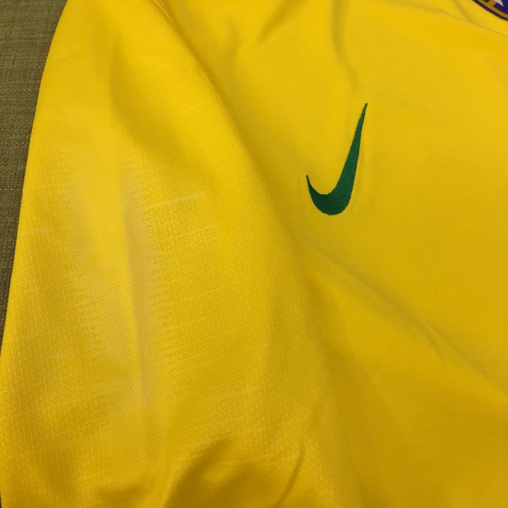 耐克2018世界杯的球迷版球衣面料更加柔软舒适,整体色调就是明亮黄配绿色,V领一体化设计,耐克logo和五星巴西队徽为缝制工艺,不是球员版的热敏压印贴合工艺。