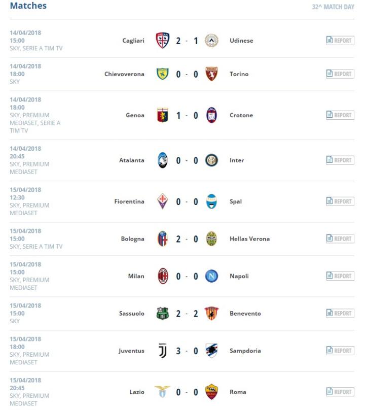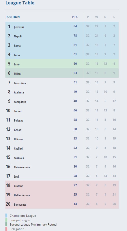 (32轮过后意甲官网的积分榜,各阶级分层清晰可见)