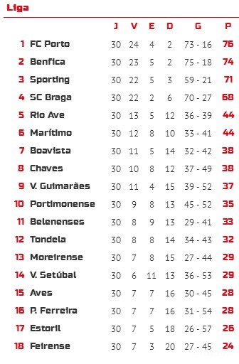 在战胜本菲卡之后,波尔图以2分的优势领跑积分榜,葡萄牙体育与本菲卡的差距也缩小到3分,仍有希望在下赛季进军欧冠资格赛(从下赛季开始:葡超冠军直入小组赛,第二名从附加赛打起)。埃斯托里尔和费拉人排名积分榜后两位。