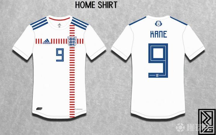 主场球衣底色为白色,搭配横竖两部分的红色条纹,细节处使用蓝色着色,很容易让人想到2001年到2003年间英格兰的队服。客场球衣用同样的设计,主色调换成红色。、