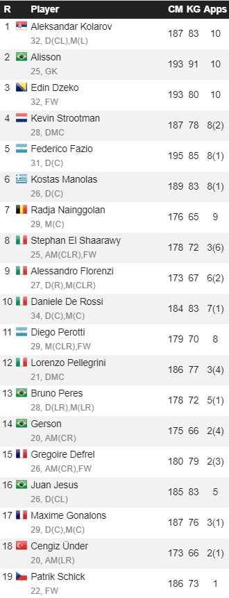 前九场比赛中,有三个位置的球员是从未更换过的:门将阿利森,左后卫科拉罗夫和中锋哲科,三人在十场欧冠比赛中全部首发。纳英格兰则出场了9次,若不是因为累积黄牌停赛,对阵巴萨的首回合他也应该是铁打不动的主力。他的中场搭档斯特罗曼和德罗西则分别首发了8次和7次,两人都在客场对卡巴拉赫和马竞的比赛中轮休,佩莱格里尼和戈纳隆是两人的替补,考虑到卡巴拉赫实力有限,对阵马竞则已基本确定出线,因此不出意外,纳英格兰——斯特罗曼——德罗西是罗马常规的中场配置。法齐奥、马诺拉斯和佩罗蒂在欧冠中同样首发了8次,前两者是罗马在欧冠比赛中的常规中卫搭档,后者则基本牢牢占据左边锋的主力位置。小胡安则是罗马在轮休中卫时的第一替补人选,他在本赛季欧冠比赛中首发了五次。