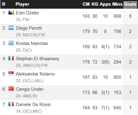 在队内的助攻榜方面,罗马的分布也非常均匀,并没有明显的助攻能力强的球员。但也能说明,罗马的中场球员,佩罗蒂、纳英戈兰、德罗西、斯特罗曼,以及后两位的替补戈纳隆和佩莱格里尼都有不错的传球能力,对每一名球员的盯防都不能懈怠,这点在后面的球员扫描中会详细谈到。此外,科拉罗夫和哲科都有两次助攻,科拉罗夫的套上传中、哲科的护球做球也是罗马常用的进攻手段。