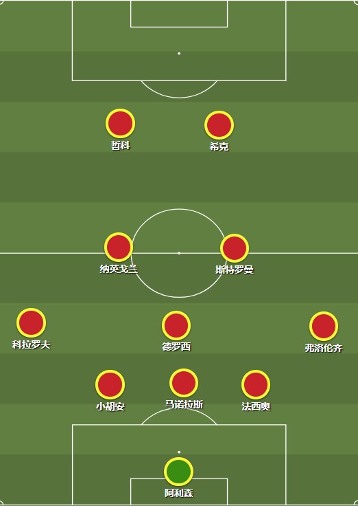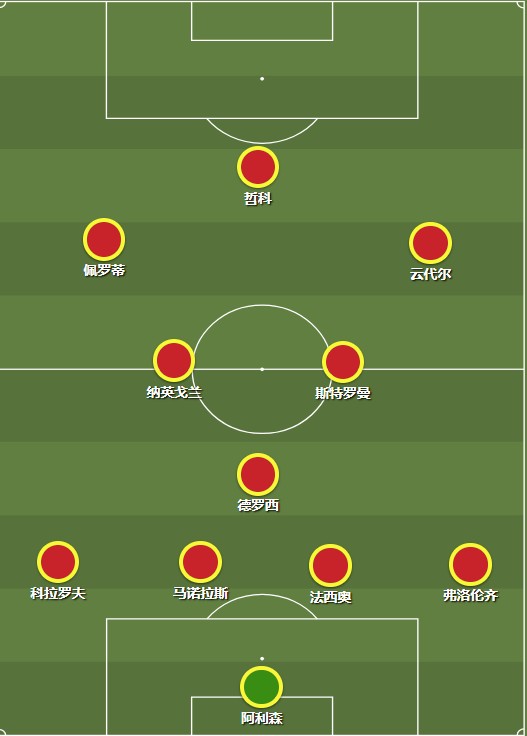 在主场翻盘巴萨和客场的罗马德比中,罗马都采用了3-5-2的阵型,两场比赛下来罗马只轮换了弗洛伦齐一名球员。年轻的中锋希克连续首发两场,与哲科搭档。