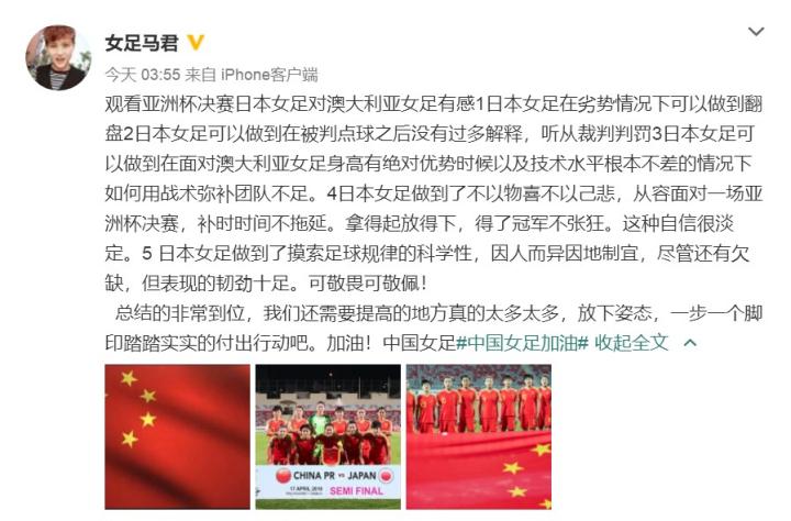 马君在个人微博上写道:“观看亚洲杯决赛日本女足对澳大利亚女足有感:1.日本女足在劣势情况下可以做到翻盘。2.日本女足可以做到在被判点球之后没有过多解释,听从裁判判罚。3.日本女足可以做到在面对澳大利亚女足身高有绝对优势时候以及技术水平根本不差的情况下如何用战术弥补团队不足。4.日本女足做到了不以物喜不以己悲,从容面对一场亚洲杯决赛,补时时间不拖延。拿得起放得下,得了冠军不张狂。这种自信很淡定。5.日本女足做到了摸索足球规律的科学性,因人而异因地制宜,尽管还有欠缺,但表现的韧劲十足。可敬畏可敬佩!”