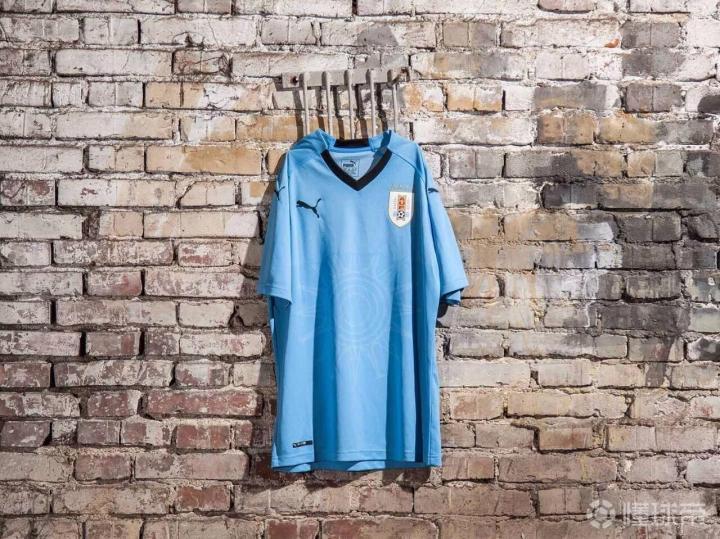 乌拉圭主场球衣除天蓝色的主色外,还增加了部分黑色元素的点缀,例如V型领口、胸前以及肩部的Puma品牌标识。