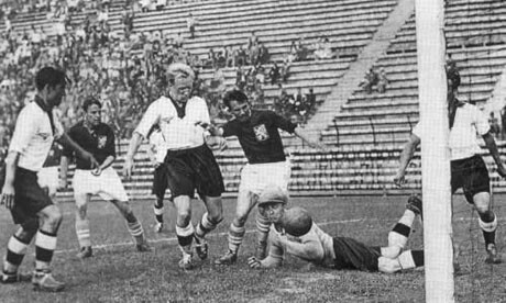 首次参加世界杯足球赛的捷克斯洛伐克队在华沙举行的首场比赛中以2-1战胜东道主。1934年春天,波兰队没有到布拉格回访,因此,捷克斯洛伐克队通往意大利的路不打自通。他们用得着难为情吗?大可不必。因为比这轻而易举的更有甚者。巴西队和阿根廷队早已在意大利秣马厉兵,然而他们各自的对手秘鲁队和智利队却根本没有露面。